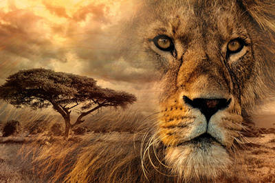Illustrée d'une tête de lion avec crinière incrustée dans une photo de savane africaine et soleil couchant.