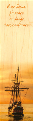 Marque-page religieux avec une citation "Avec Jésus j'avance au large en confiance" illustrée d'un voilier sur fond de soleil couchant