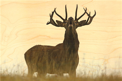 Carte postale en bois illustrée d'une photo noir et blanc d'un cerf en plein brame