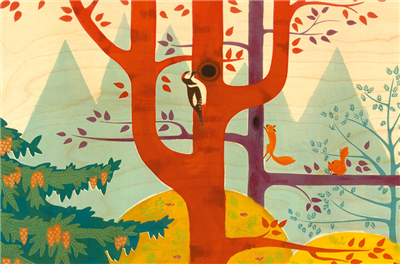 Carte postale en bois illustrée d'un dessin coloré d'arbres et de montagnes ou s'ébattent un pic épeiche et des écureuils roux...Illustration : Anaïs Mazuez
