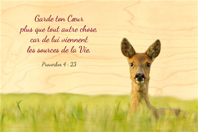 Carte religieuse avec proverbe "Garde ton cœur plus que tout autre chose car de lui viennent les sources de la vie" et illustration chevrette dans l'herbe